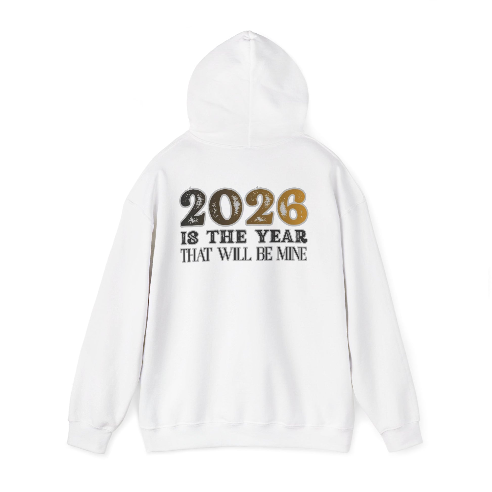 This cozy hoodie carries a quiet confidence: bold “2026” numerals stretch across the chest, with the line “is the year that will be mine” beneath, printed in a distressed, vintage-inspired type. The medium-heavy 50/50 cotton-poly blend feels soft against your skin while holding its shape through countless washes. A double-lined hood with a color-matched drawcord and a roomy kangaroo pouch add everyday function and comfort.